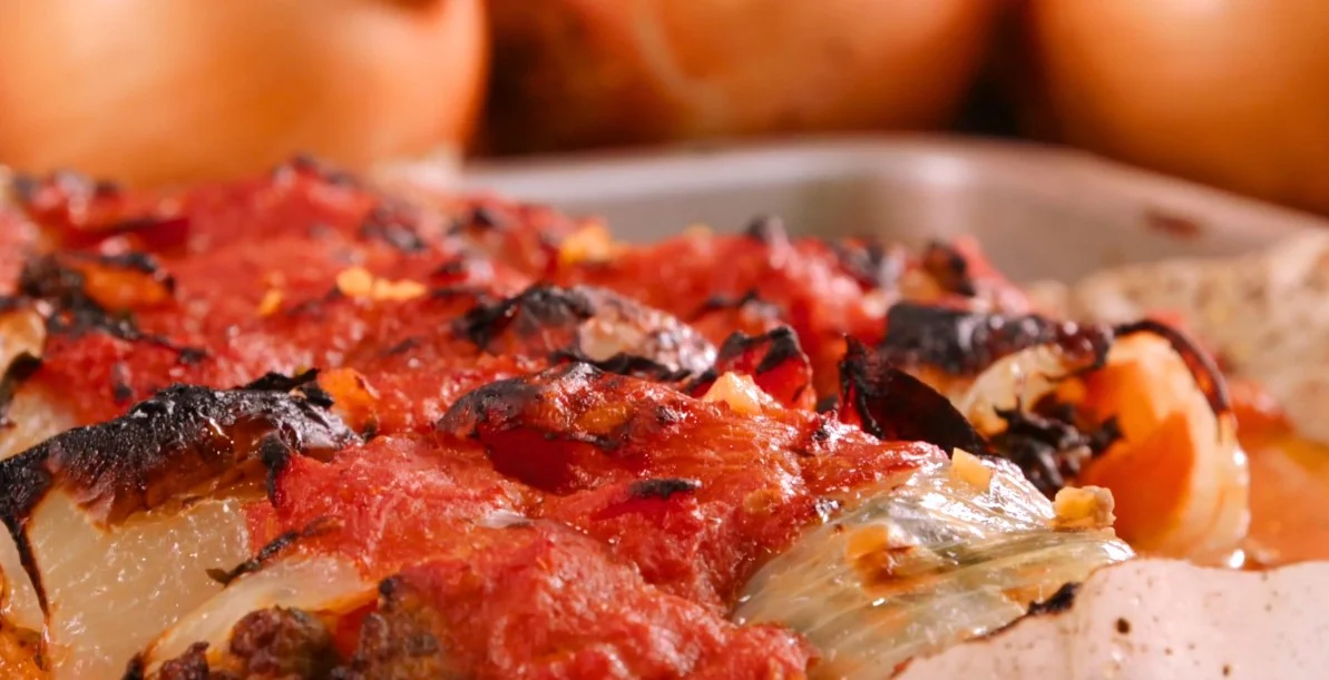 - Cover the stuffed onion with crushed tomatoes. Bake for 5-10 minutes, until the onions are tender and flavours are melded.