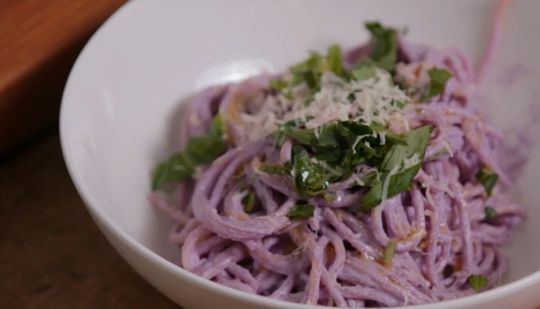 - In a large mixing bowl, toss the pre-cooked spaghetti with the freshly made purple pesto, ensuring the pasta is evenly coated. Garnish with extra basil leaves, a sprinkle of Parmesan, and a crack of black pepper for added flavour.
